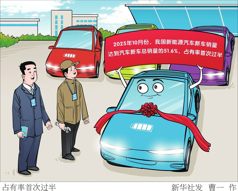 新华社北京11月11日电(记者 唐诗凝)中国汽车工业协会11月11日发布数据显示,2025年10月份,我国新能源汽车产销同比保持快速增长,新能源汽车新车销量达到汽车新车总销量的51.6%,占有率首次过半。