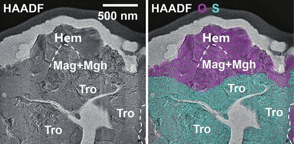 左图是使用透射电子显微镜拍摄的赤铁矿晶粒的高角度环形暗场像,右图是使用两种特征元素区分的铁氧化物(氧元素,品红色)颗粒和陨硫铁(硫元素,青色)颗粒的接触关系。(受访单位供图)
