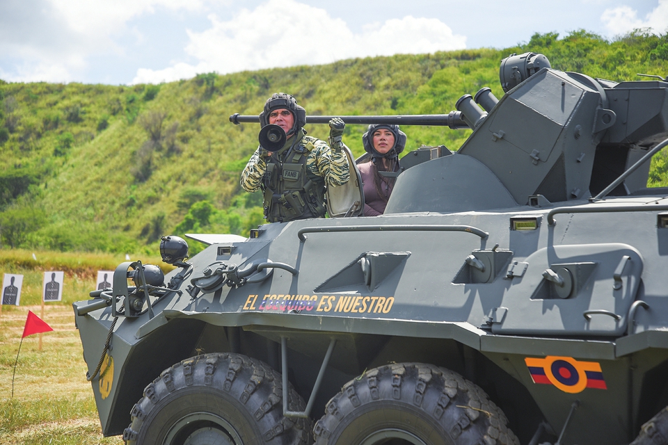 2025年9月13日,委内瑞拉国防部长帕德里诺·洛佩斯(左)在位于首都加拉加斯的蒂乌纳堡陆军基地视察民兵训练。新华社发(萨尔戈多摄)