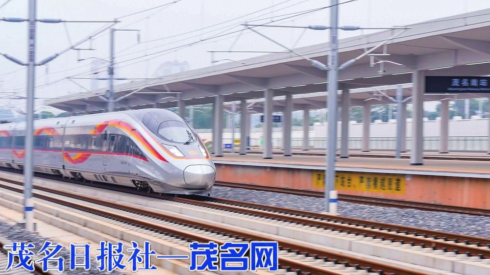 广湛高铁试运行列车在茂名南站飞驰而过。茂名晚报记者 黄宇彬 摄