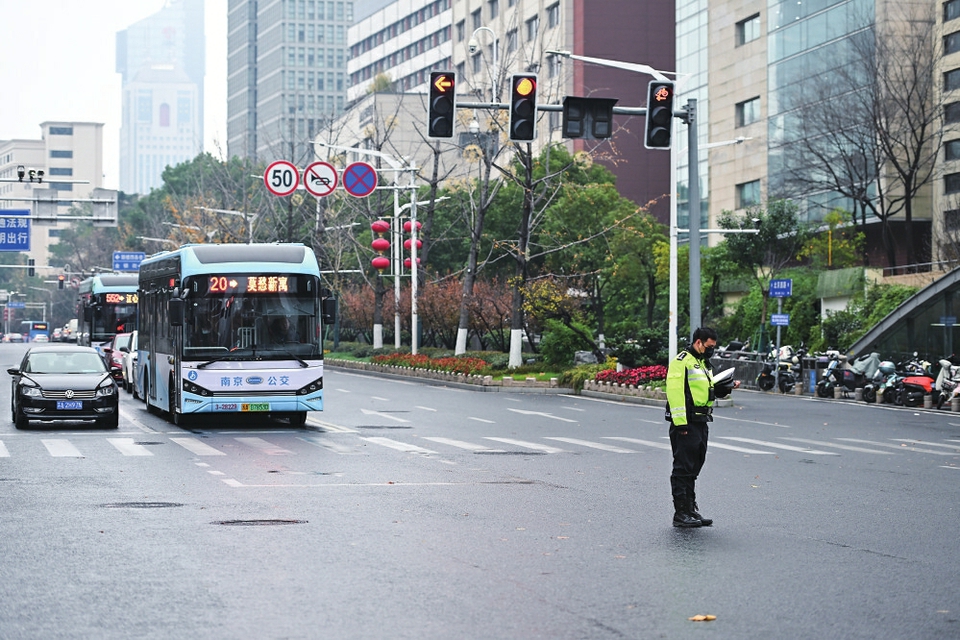 12月13日,南京交警在街头默哀。新华社发(杨素平 摄)