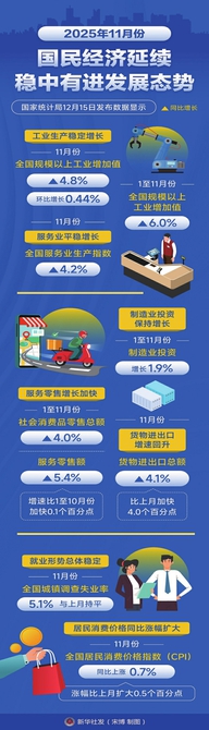 15日,我国11月份主要经济指标出炉。各项指标运行情况如何?国民经济呈现哪些趋势特点?在国新办当天举行的新闻发布会上,国家统计局新闻发言人付凌晖介绍了相关情况。