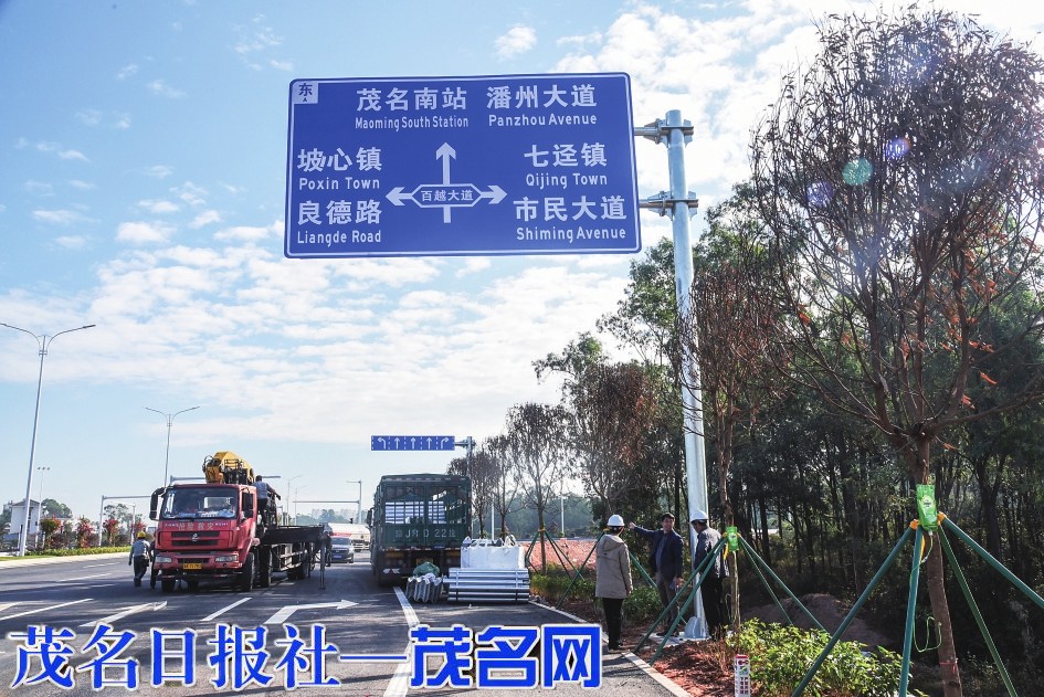 安装路牌。茂名日报社全媒体记者 黎雄 摄