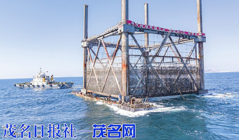 茂名晚报讯 12月17日上午11时,一座海上“庞然大物”——升降式桁架网箱从湛江东海岛海域拖航至茂名滨海新区大竹洲岛南侧既定海域,海上施工队伍随即进行四条站桩的下沉作业,这标志着茂名滨海发展集团大竹洲海洋产业园(海洋牧场类)一期项目进入投产倒计时。
