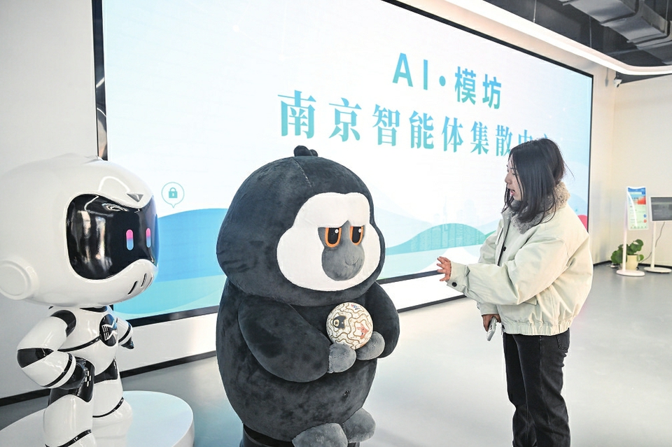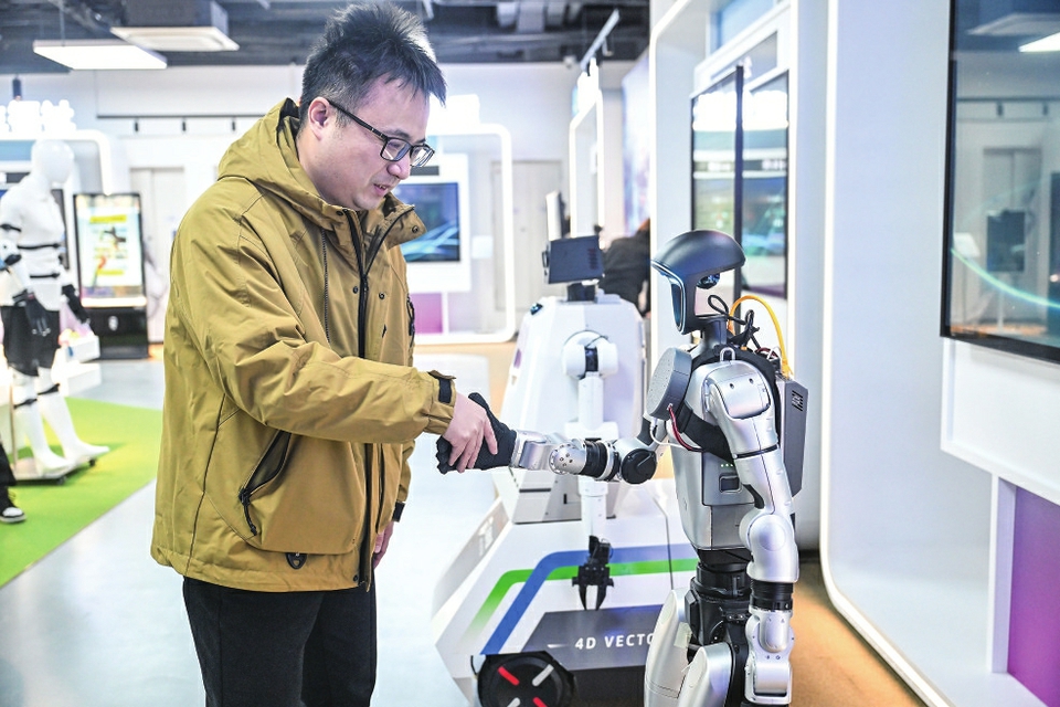 12 月 4日,在南京人工智能生态街区的“AI·模坊”南京智能体集散中心,工作人员与机器人握手。