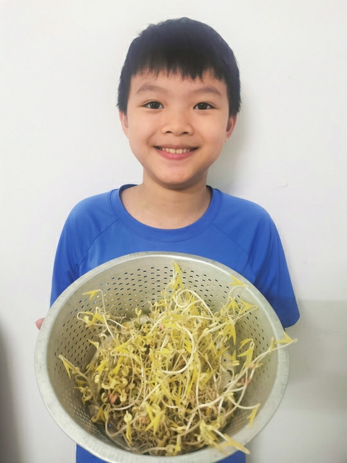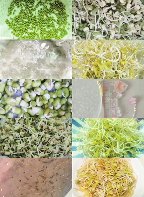 一大早,我就迫不及待地跑去看我的绿豆宝宝。我小心翼翼把托盘拿到到没有光线的房间里揭开毛巾和盖子,发现绿豆冒出了约5厘米的小芽,像一只只小蝌蚪。我继续给它们浇水、再把渗到托盘的水倒掉。