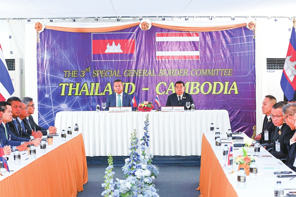 12月27日,在泰国尖竹汶府边境口岸,泰国国防部长纳塔蓬(右)和柬埔寨副首相兼国防大臣迪西哈举行会谈。新华社记者 孙玮彤 摄