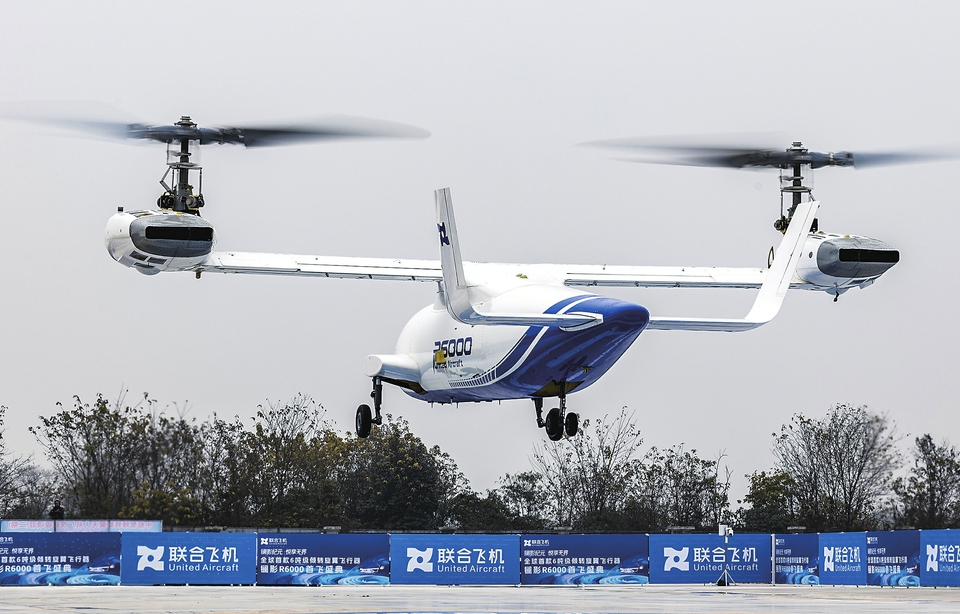 12月28日,6吨级无人倾转旋翼飞行器“镧影R6000”垂直起飞。