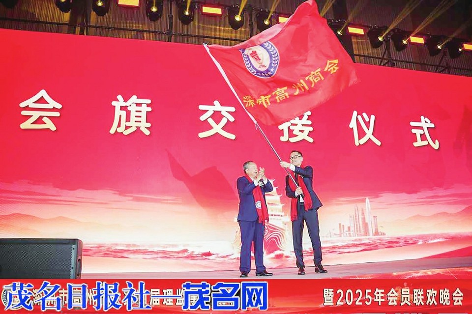 茂名晚报讯 12月28日晚,以“新·大航海时代”为主题的深圳市高州商会第四届理监事会就职典礼暨2025年会员联欢晚会在深圳市前海国际会议中心举行。广东省人大常委会原副主任邓维龙,广东省文联原专职副主席邹继海,茂名市委常委、统战部部长吴卫华,茂名市委统战部副部长、工商联党组书记李庆川,茂名市人民政府驻广州办事处党组书记、主任麦哲伦,高州市政协主席张万盛等领导,以及各兄弟商会代表、高州乡贤与会员代表齐聚现场,共同见证商会传承启航的重要时刻。
