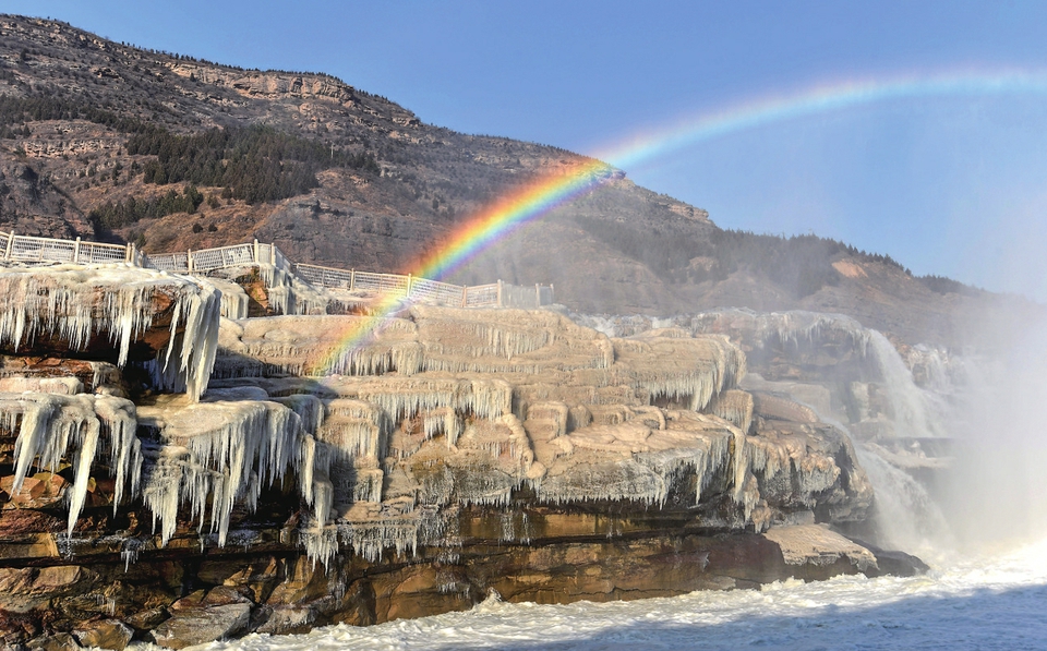 黄河壶口瀑布出现冬日彩虹美景。(吕桂明摄)