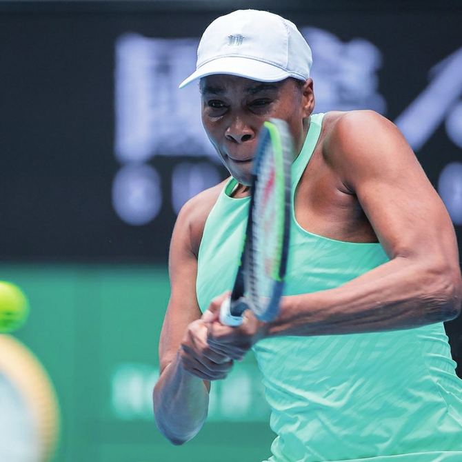2021年2月8日,美国选手维纳斯·威廉姆斯在澳网女单首轮比赛中回球。新华社发(胡泾辰摄)