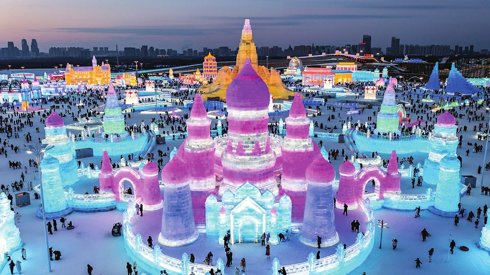 2026年1月1日,游客在哈尔滨冰雪大世界园区内游玩,欢庆新年的到来(无人机照片)。新华社发(王昭博 摄)