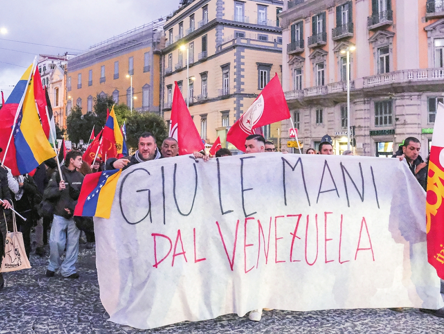 ▲1月3日,在意大利那不勒斯,当地民众手持写有反对干涉委内瑞拉内容的标语参加抗议活动。新华社发