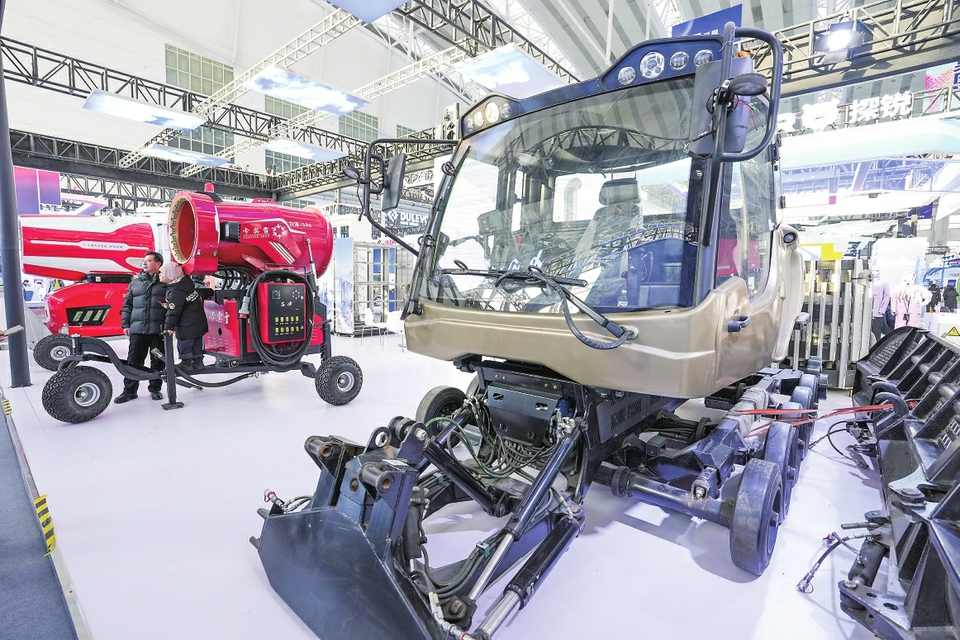 展会现场,工业级无人除雪机、雪地摩托、碳纤维滑雪板、户外冰雪服装等冰雪产品纷纷亮相,展现了科技与绿色理念的深度融合。