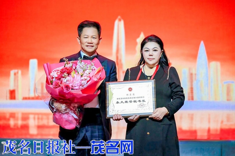 2025年11月22日晚,深圳市茂名商会第六届理监事会就职典礼举行,近千名企业家济济一堂。会上,深圳市茂名商会首席会长郑月英被授予“永久荣誉秘书长”称号,以表彰她十年来为商会发展倾注的心血与作出的突出贡献,全场掌声雷动。