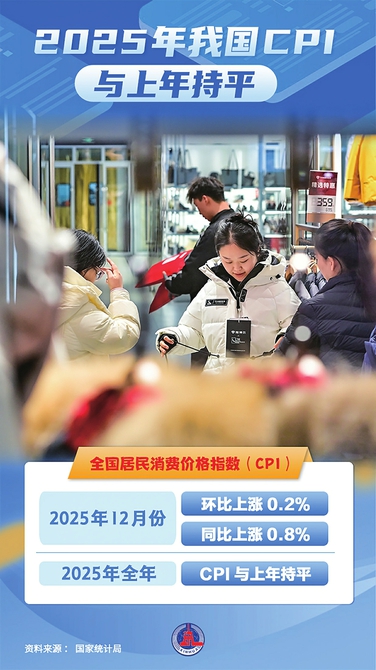 新华社北京1月9日电(记者王雨萧)国家统计局1月9日发布数据显示,2025年12月份,全国居民消费价格指数(CPI)环比上涨0.2%,同比上涨0.8%;2025年全年,CPI与上年持平。
