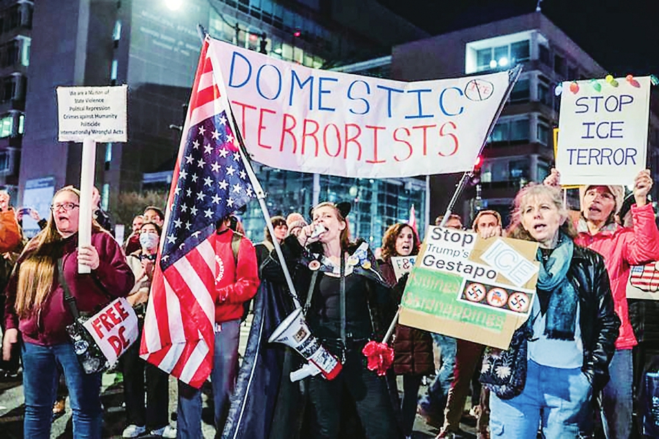 2026年1月8日,示威者在华盛顿集结,随后游行前往白宫,抗议移民与海关执法局人员在明尼阿波利斯枪杀蕾恩·妮科尔·古德。