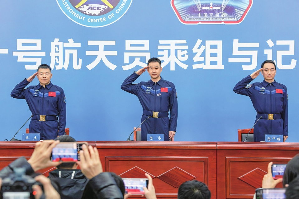 1月16日,航天员陈冬(中)、陈中瑞(右)、王杰(左)敬礼致意。 1月16日下午,中国航天员科研训练中心在北京航天城举行神二十乘组与记者见面会,航天员陈冬、陈中瑞、王杰太空归来后首次公开亮相。 新华社记者李明刚摄