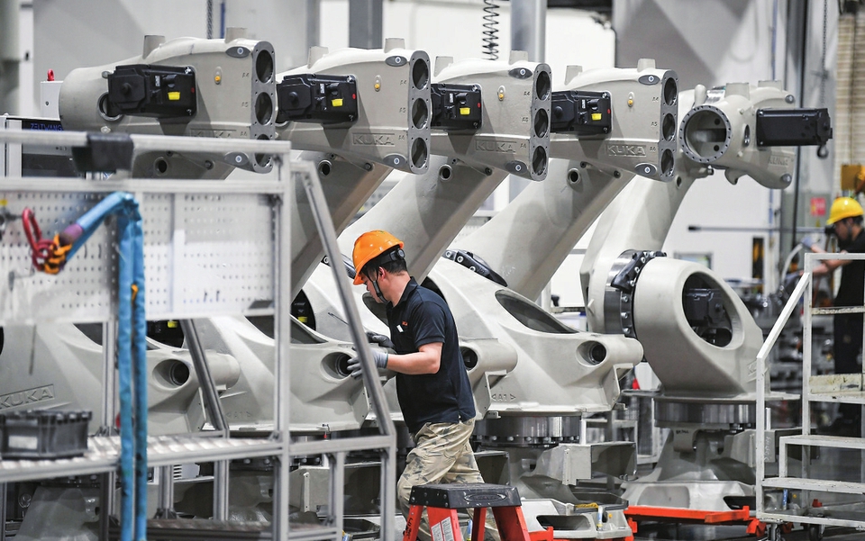 2025年3月25日在广东佛山市美的库卡智能制造科技园拍摄的工业机器人产线车间。 新华社记者 邓华 摄