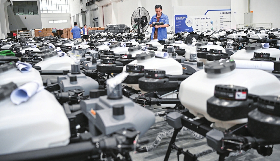 2025年6月26日,工作人员在联合飞机集团深圳基地植保无人机仓库内巡视。 新华社记者 邓华 摄