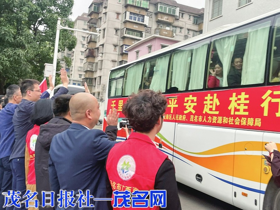 务工人员与欢送人员挥手致谢。