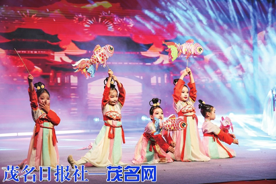 晚会深度融合“茂名元素”,让孩子们在热情洋溢的表演中增强对家乡的认同感。开场节目便是一大亮点,舞蹈《华彩新章赋马新声》以冼太夫人“好心”精神为内核,串联鳌鱼舞、大头娃娃、木偶戏三大本土非遗元素,70余名孩子化身“小马”奔腾起舞,气势恢宏,传递着新春祝福,也彰显马年奋进之势;舞蹈《戏鱼灯》则从茂名深厚的鱼灯文化中汲取灵感,孩子们手执精致鱼灯,以轻盈碎步和柔美身姿模拟鱼儿游动,灯影摇曳,童趣盎然;原创童谣《籺香贺年》以情景表演唱形式,生动展现高州吃籺贺岁的传统习俗;另一由广东石油化工学院师生围绕茂名罗非鱼产业创作的原创童谣《金鳞谣》中,孩子们时而模仿游鱼姿态,时而整齐列队,以生动的演绎传递对家乡产业的礼赞。“这首歌不仅好听,还让我知道了我们茂名的罗非鱼产业这么厉害!”参演的小朋友兴奋地说。