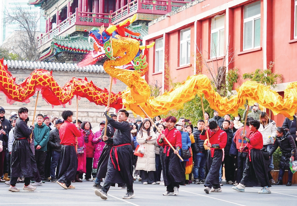 2月10日,民俗表演爱好者在济南上新街表演舞狮。 新华社记者 徐速绘 摄