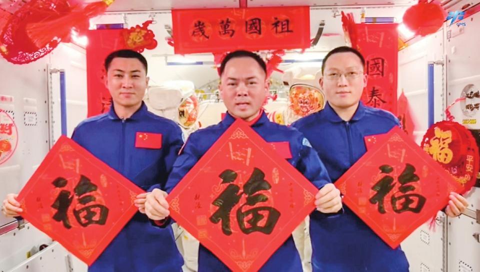 春节前夕,神舟二十一号航天员乘组在中国空间站向全国人民拜年(视频截图)。新华社发