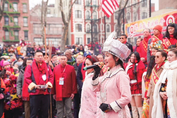 歌手在美国纽约中国城的庙会现场演唱歌曲。