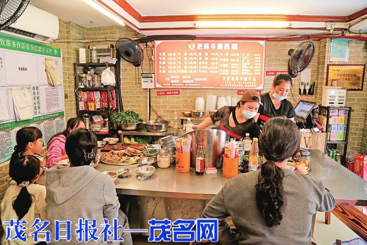 漫步街道,两旁的牛杂店不断映入眼帘,牛杂麻辣烫、牛腩粉、萝卜牛杂的香气弥漫整条街,热气腾腾的锅里翻滚的烟火气息,让人忍不住停下脚步、一尝为快。多家老字号牛杂店内座无虚席,老板和服务员手不停歇地熬着汤底、剪着牛杂。客人围坐一桌、现点现吃,欢声笑语伴着食物的香气交织在一起,格外热闹。“过年回家,最惦记的就是这一口牛杂,只要吃上一碗心里就满足了,这就是我心中的年味。”从广州回茂名过年的陈先生说。