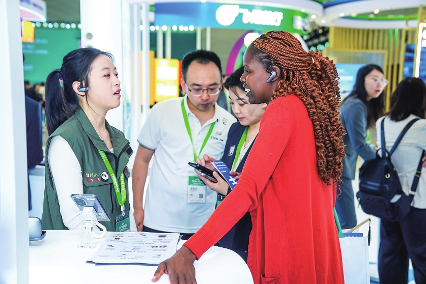 ?在海口举办的2025中国国际旅游交易会上,海外客商体验讯飞AI翻译耳机。新华社发