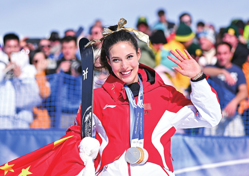 2月22日,冠军中国选手谷爱凌在颁奖仪式后向观众致意。新华社记者 张宏祥 摄