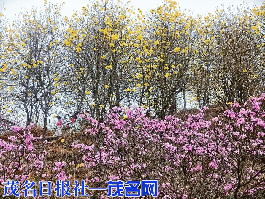 在高州挂榜岭森林公园,山上的黄花风铃与山下的红花风铃互相映衬,色彩艳丽。市民花下游玩、拍照,欢笑声荡漾其中,充满诗情画意。通讯员黄诒高摄