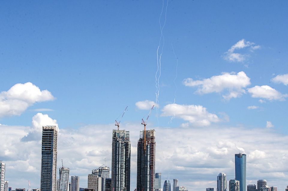 这是2月28日在以色列特拉维夫市区拍摄的以军防空系统发射拦截弹留下的白色烟轨。 新华社记者 陈君清 摄