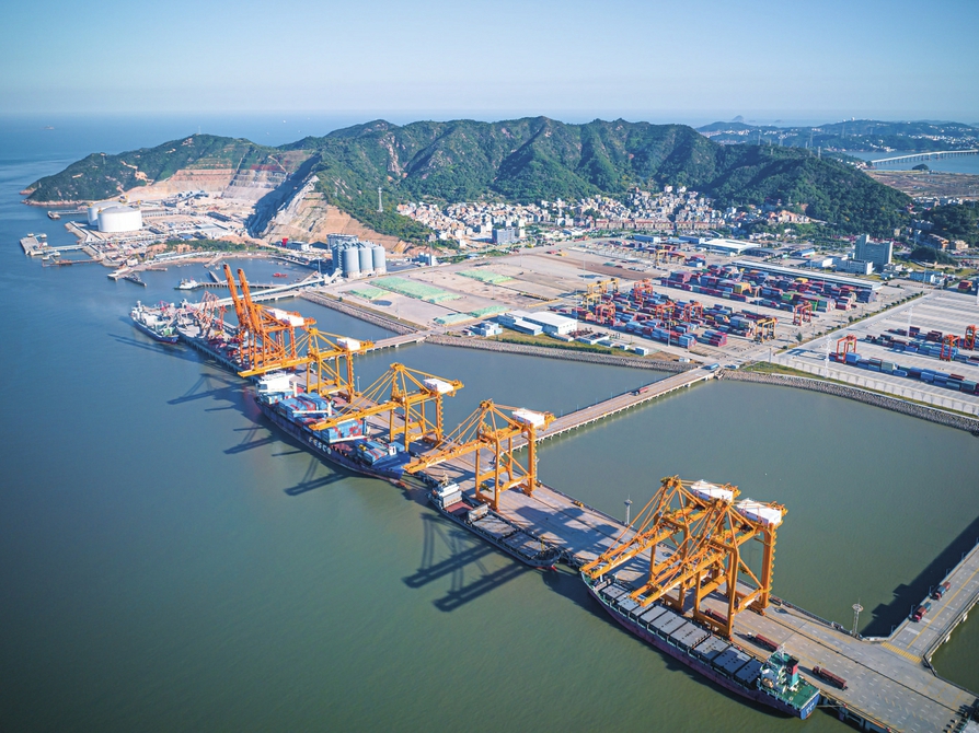 货轮停靠在温州港状元岙集装箱码头卸载集装箱(无人机照片)。新华社记者 江汉 摄