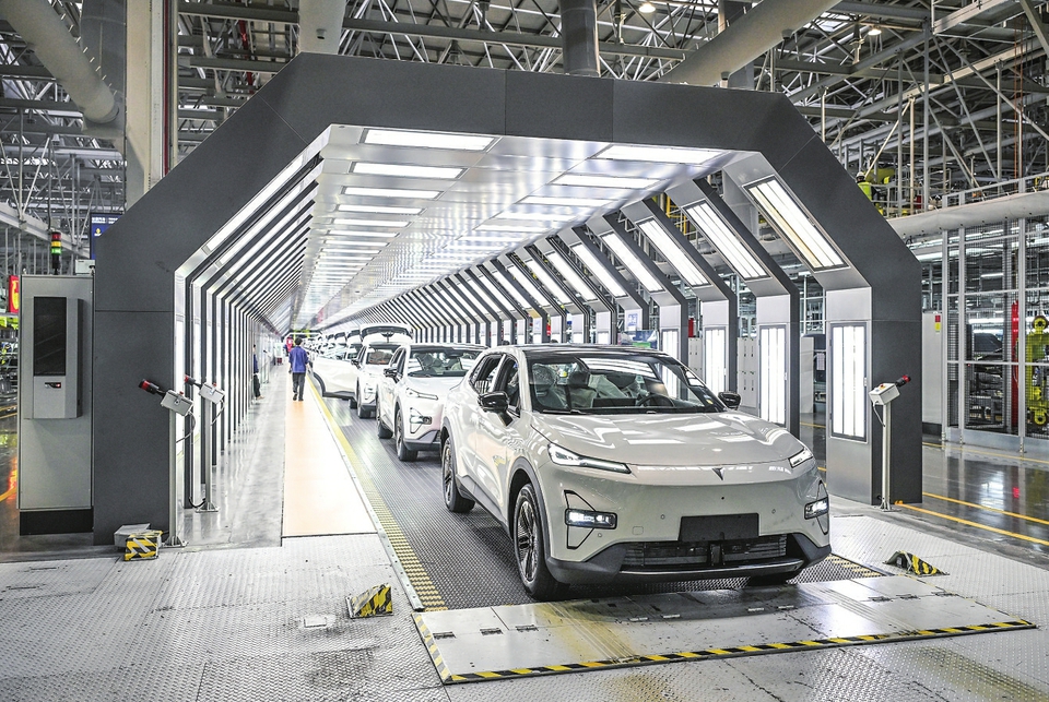 在位于重庆市渝北区的长安汽车数智工厂总装车间拍摄的即将下线的新能源汽车(2025年1月9日摄)