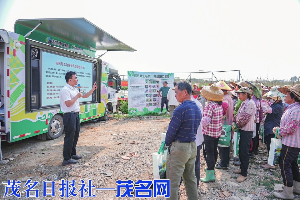 茂名晚报讯 3月19日上午,茂名市林业局走进电白区林头镇槟榔村,开展“守护‘羽’众不同的未来”2026年茂名市爱鸟周宣传活动。本次活动以野生鸟类保护为主题,讲解生态友好型防鸟网规范使用,普及野生鸟类保护法律法规,面向当地农户与群众开展精准宣讲,切实筑牢基层生态保护防线。