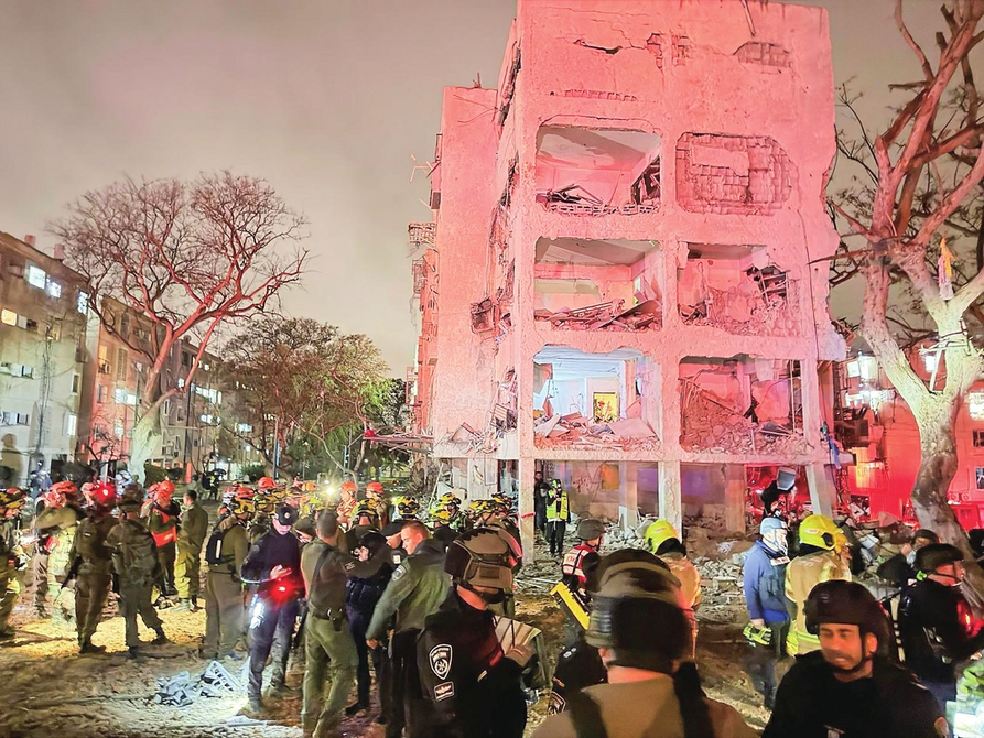 3月21日晚,在以色列南部城市阿拉德,应急反应人员在一处导弹袭击点开展工作(手机照片)。新华社发