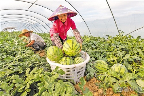 “你们来得正好,快尝尝我们的西瓜!”走进新圩镇新北村的西瓜种植基地,基地负责人潘显斌端上来一盘鲜红脆甜的西瓜,招呼记者一行品尝。大棚里,在郁郁葱葱的瓜藤掩映下,一个个圆润饱满的西瓜躺在白色薄膜上,等待着被采收、分拣、打包、装车后运往全国各地。潘显斌说,基地一年种两茬西瓜,年亩产量约8000斤,行情好的话年亩产值可达2万元。