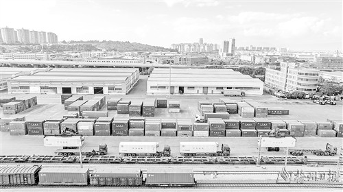 图为中老铁路国际货物列车在云南省昆明市王家营西站进行装箱作业。