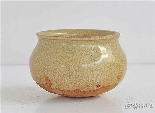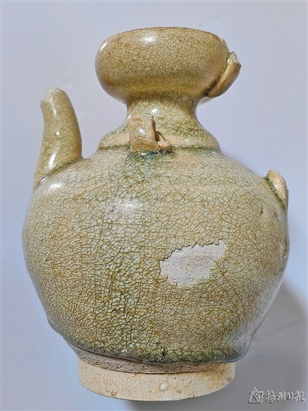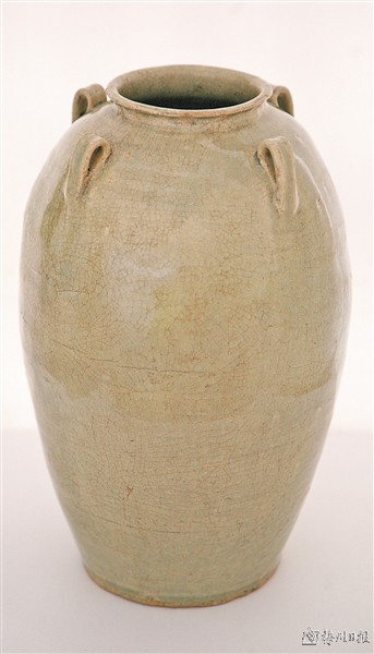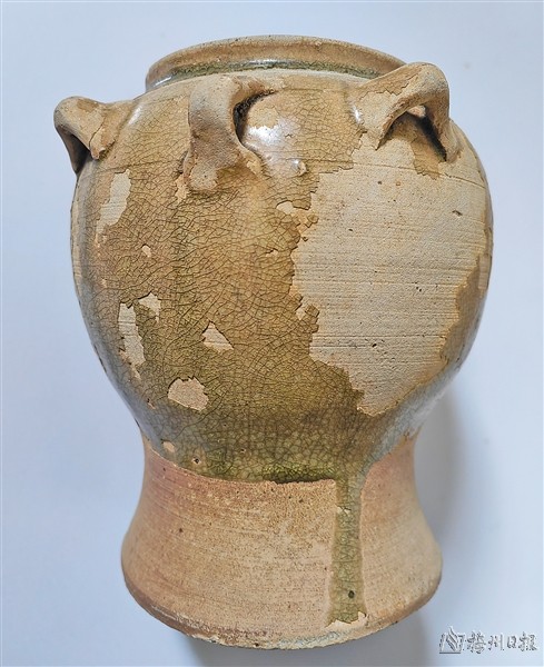 梅县水车窑青瓷四系罐(图①),属唐代青瓷,器型硕大,33×22厘米(罐口10.6厘米),保存完好,类椭圆形,为水车窑高身壶最典型的造型,釉色莹润、古拙素净,曾在2008年中央电视台“寻宝”大型活动中被专家评审团评定为“梅州民间国宝”。