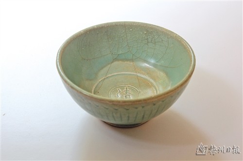 明代早期大埔余里窑生产的青釉“清”字碗(图⑤),口径14.5厘米、底径6.5厘米、高7厘米。此碗碗口内收、斜腹、圈足、胎体厚重,通体内外施青釉,外壁刻划菊瓣纹饰,施釉均匀。碗内施釉上厚下薄,厚为青色、薄为白色,碗内底部划刻双圈,双圈内刻行书“清”字标识。整体釉厚透明,晶莹似琉璃,为大埔余里窑址的典形器型。