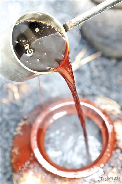 等候多时,瓮中的娘酒终于沸腾。揭开瓮盖,酒香四溢。舀上一勺,热腾腾的“红汤”如虹般注入碗中。在阳光的映射下,娘酒色泽红褐透亮;轻轻一晃,更是浓郁得挂壁。