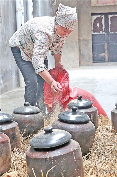 经过数日发酵后,将娘酒从酒糟中过滤出来,装入尺寸更小的酒瓮。