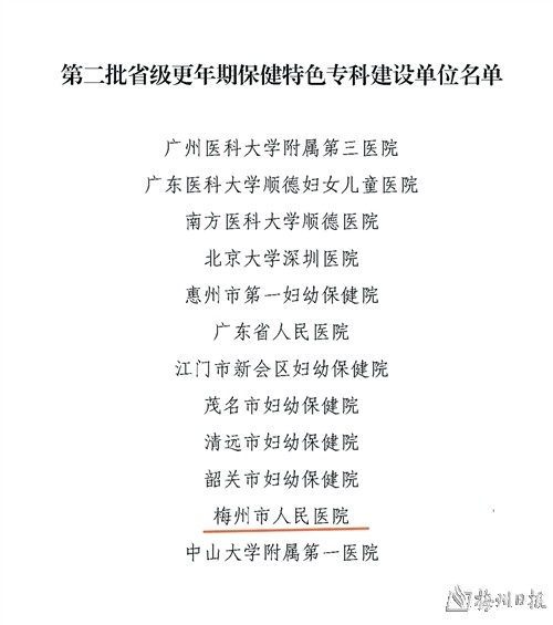 梅州市人民医院获批广东省更年期保健特色专科建设单位