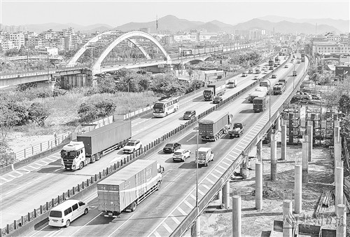 图为广州北二环改扩建工程现场交通流量大、施工难度高。