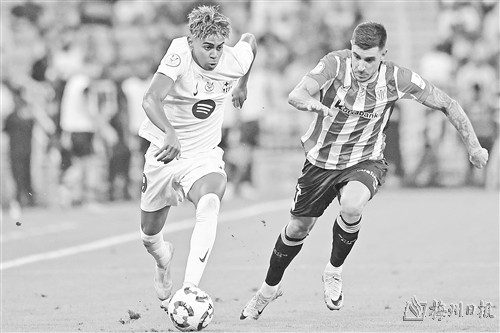 1月8日,巴塞罗那队球员亚马尔(左)和毕尔巴鄂竞技队球员贝尔希什拼抢。