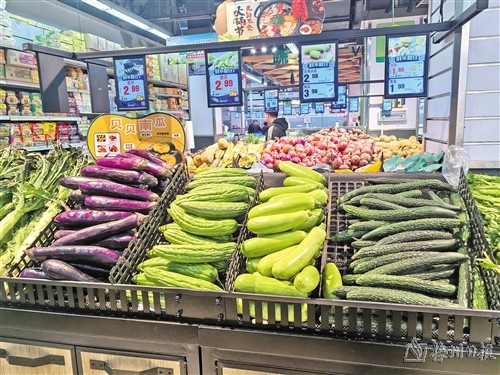 梅城江北一大型超市各类新鲜蔬菜、水果整齐摆放在货架上,产品量足价稳。(李艳良 摄)