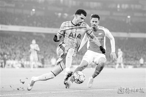 图为1月15日,阿森纳队球员萨利巴(右)与托特纳姆热刺队球员索兰克拼抢。(新华社)