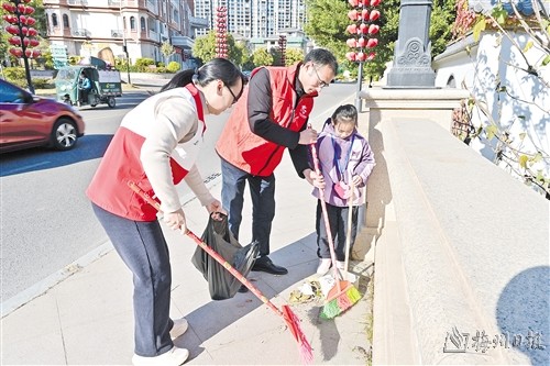 活动现场,志愿者清扫路面。(钟小丰 摄)